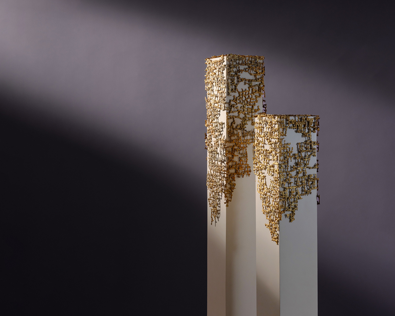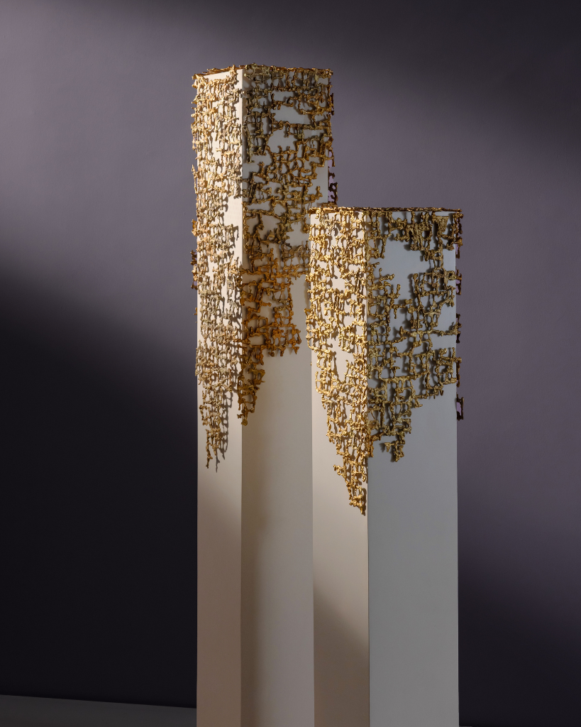 This sculptural piece, constructed with cement and adorned with delicate gold embellishments, stands as a metaphor for the intersection of strength and fragility. The solid, industrial nature of the cement symbolizes the permanence of structure, resilience, and the grounding forces of human existence. In contrast, the gold ornamentation, intricate and almost organic in its flow, represents both the preciousness of life and the vulnerability woven into even the most rigid constructs.