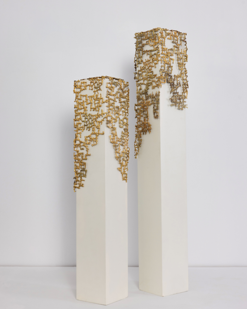 The juxtaposition of these materials reflects on the deeper theme of impermanence within permanence—how beauty, wealth, and external adornment, though captivating, are ephemeral in the grander scheme of time. The gold embellishments appear to erode or cascade down the cement columns, as if nature itself is reclaiming the material, reminding us of the inevitable decline and transformation all things undergo.