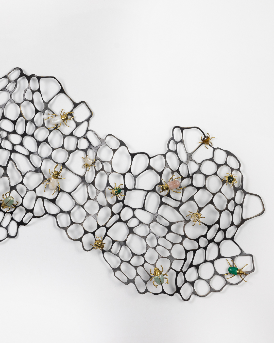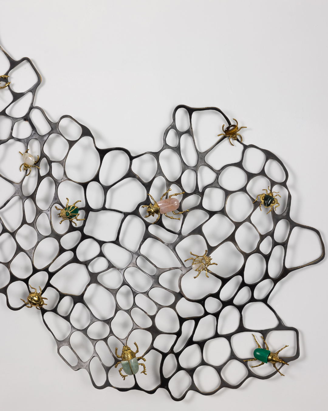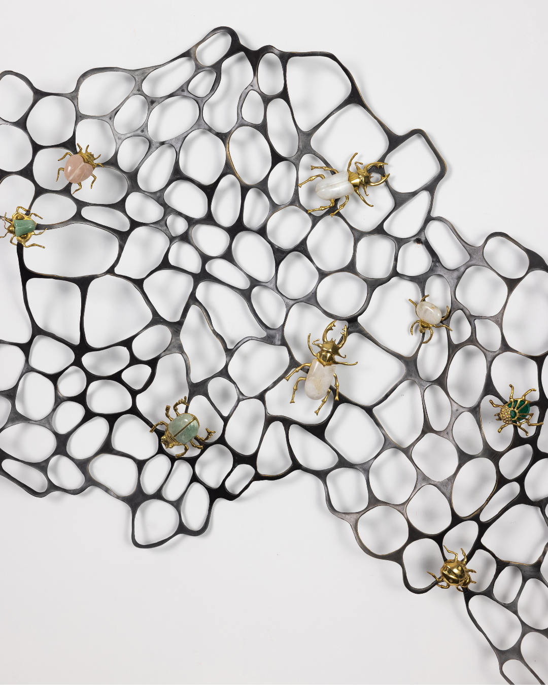 This artwork titled, Wall Wide Web (www), is an ode to the power of metallic crafting. This artwork features an intricate, organic-looking metal mesh, which resembles a sprawling, abstract web or a natural cellular structure. The black metal framework has an airy, open design, creating a delicate contrast against the wall. Scattered across the mesh are beautifully crafted insects, each with vibrant and glossy exteriors. These bugs, rendered in rich hues of emerald, ivory, and soft pastels, seem to crawl over the structure as if inhabiting their own environment. Their detailed forms, with shiny metallic accents, bring a touch of whimsy and elegance to the piece. The interplay of light and shadow through the mesh further adds dimension, giving the entire work a dynamic, three-dimensional feel.