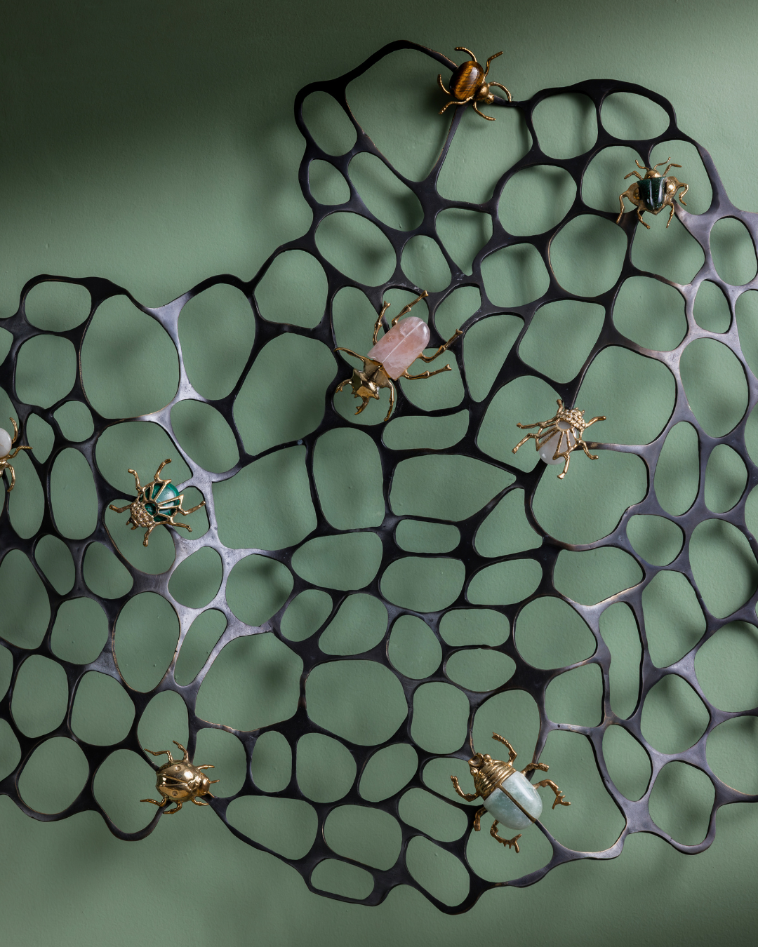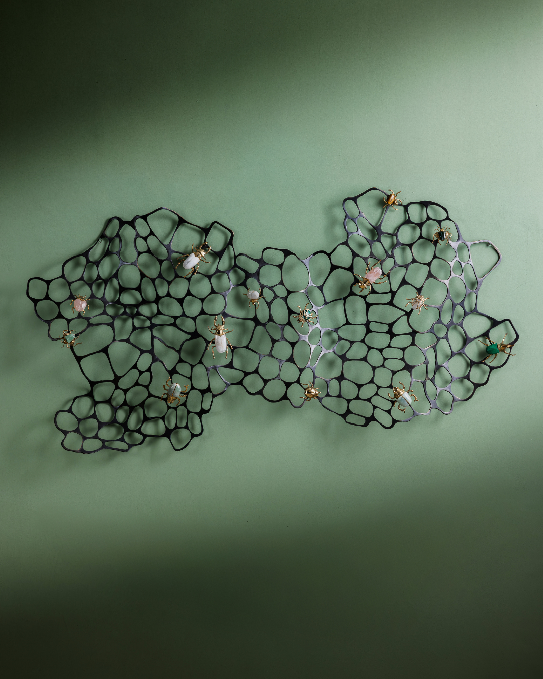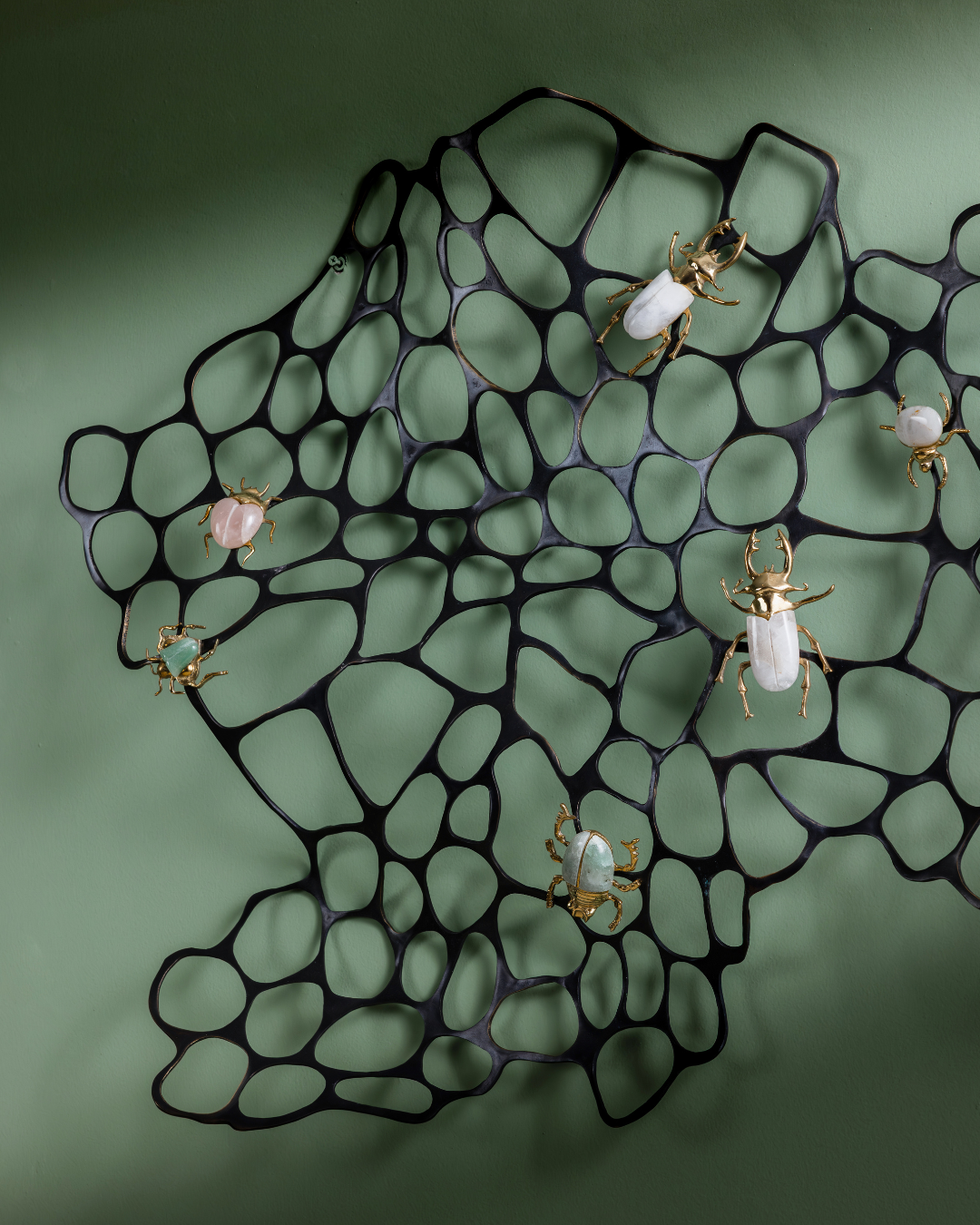 This artwork titled, Wall Wide Web (www), is an ode to the power of metallic crafting. This artwork features an intricate, organic-looking metal mesh, which resembles a sprawling, abstract web or a natural cellular structure. The black metal framework has an airy, open design, creating a delicate contrast against the wall. Scattered across the mesh are beautifully crafted insects, each with vibrant and glossy exteriors. These bugs, rendered in rich hues of emerald, ivory, and soft pastels, seem to crawl over the structure as if inhabiting their own environment. Their detailed forms, with shiny metallic accents, bring a touch of whimsy and elegance to the piece. The interplay of light and shadow through the mesh further adds dimension, giving the entire work a dynamic, three-dimensional feel.
