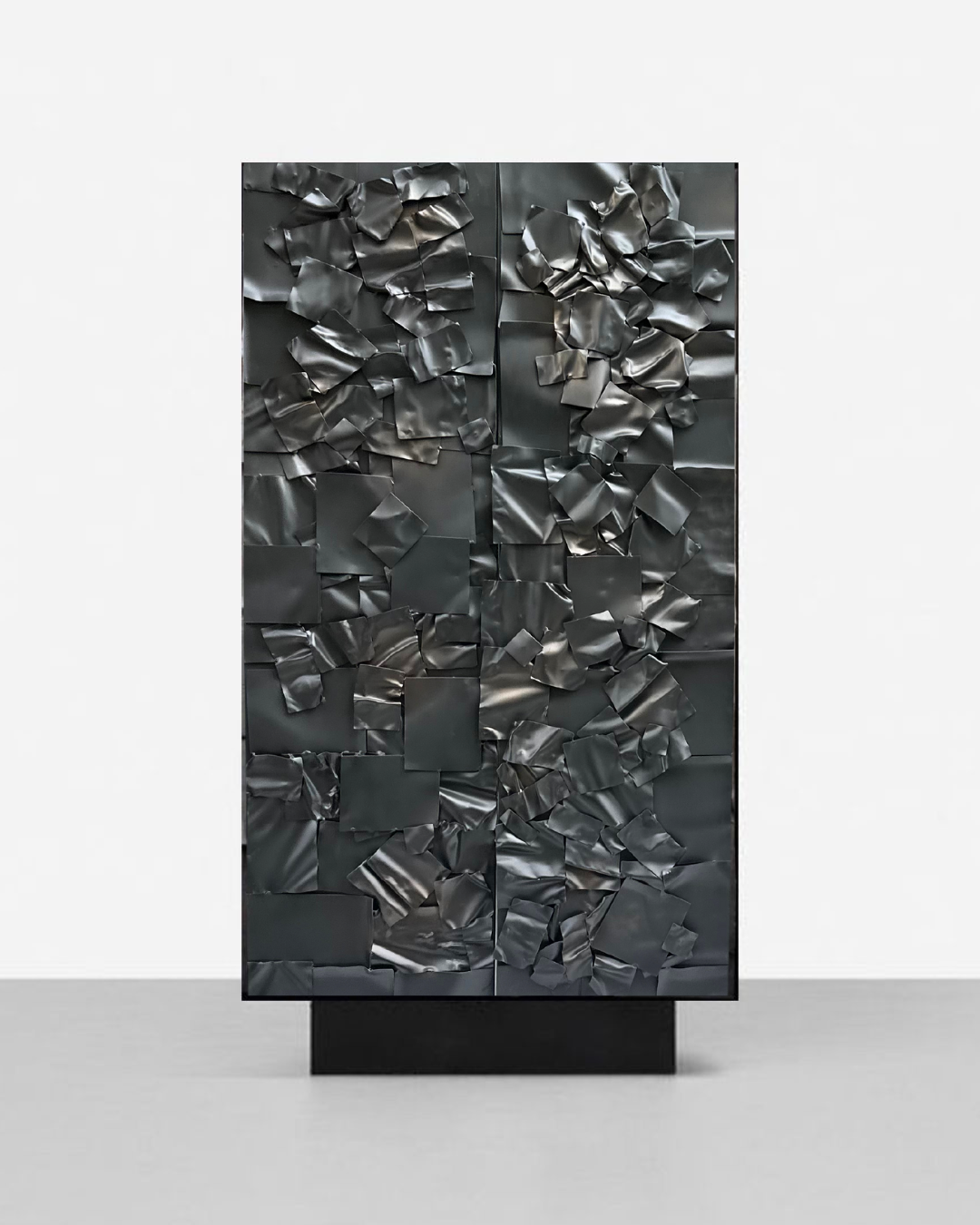This vertical cabinet from the Vagues de Métal collection embodies the restless energy of the sea – waves colliding with rocks, shaping and reshaping the land. Crafted in aluminum with veneere on ply, the surface has been hand-hammered and molded to capture the rhythm of waves frozen mid-motion.