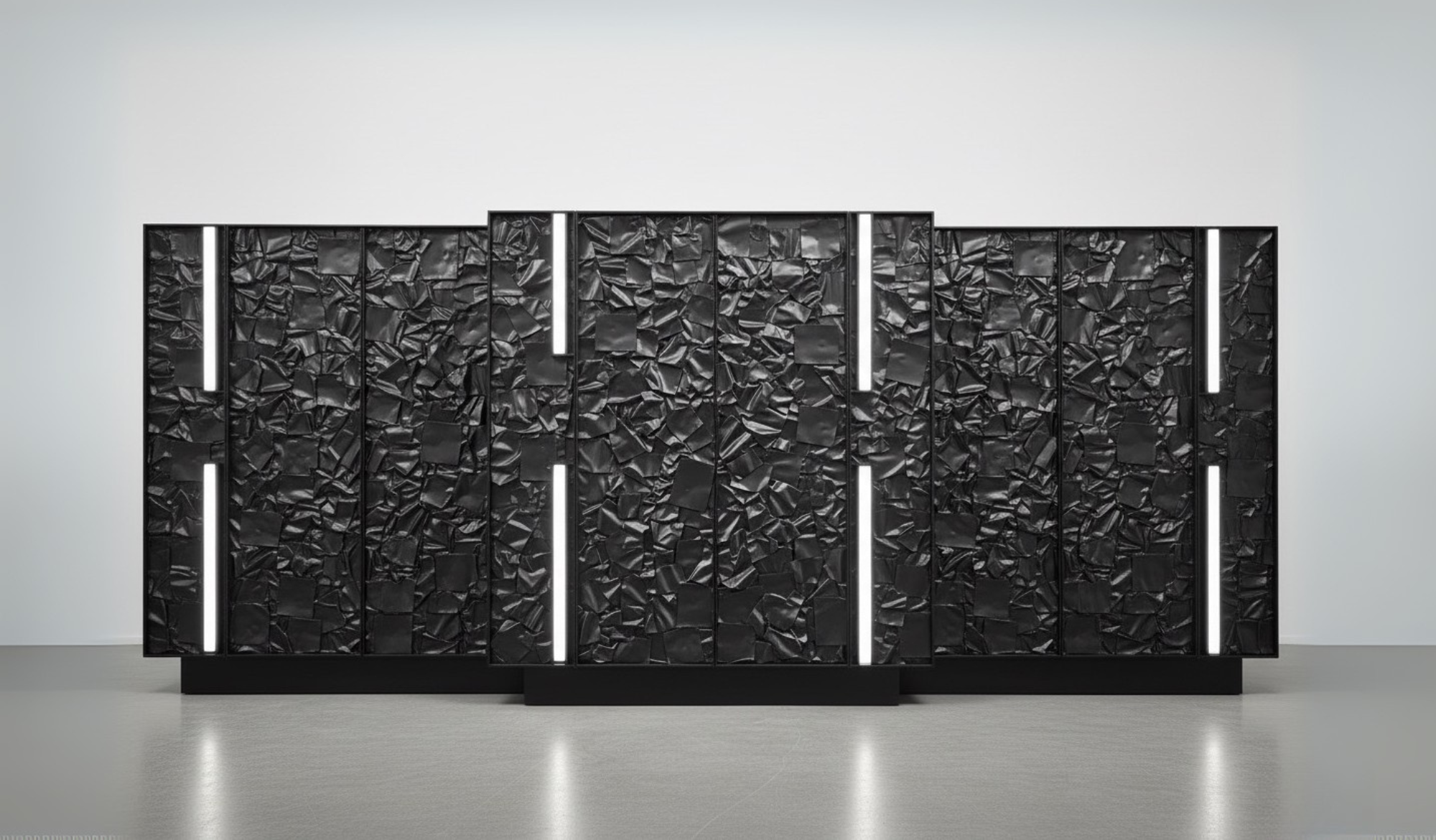 Tranquil Waves from the Vagues de Métal collection embodies the quiet aftermath of the sea’s untamed power – that moment when turbulence dissolves into stillness. The hand-sculpted metal surface, with its rippling folds and fluid textures, suggests waves settling into calm, their energy softened into rhythm. Vertical lines of light break through the dark expanse like glimmers on water, offering a sense of balance and serenity.