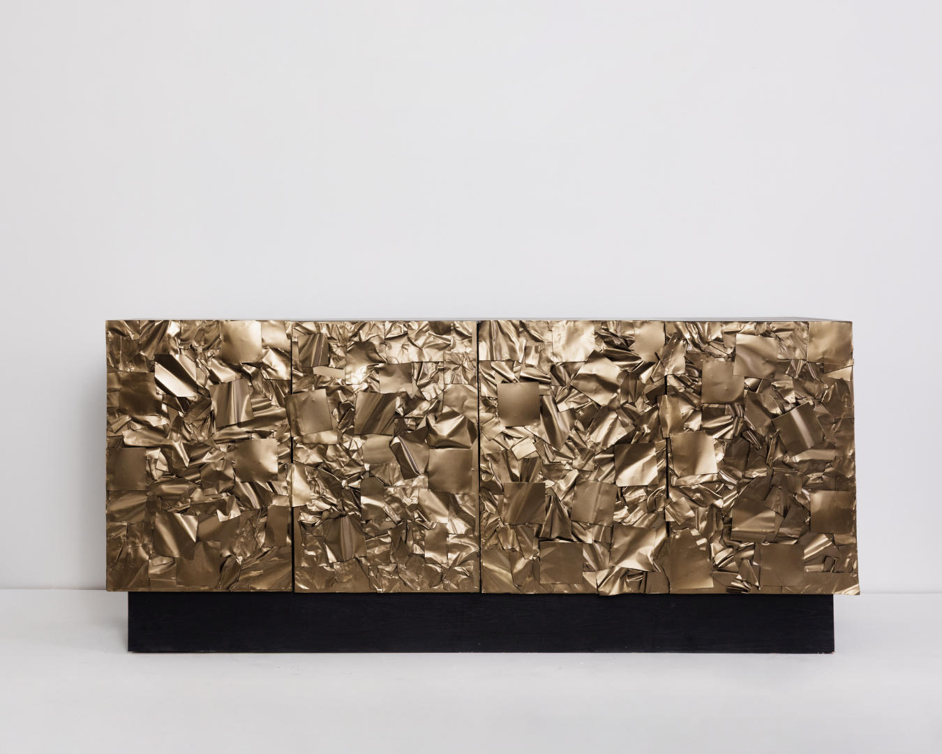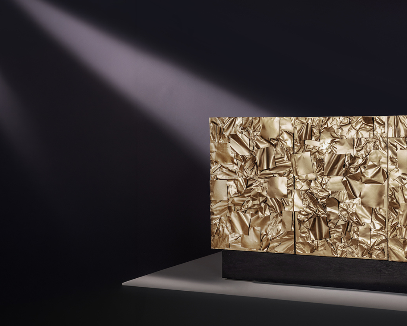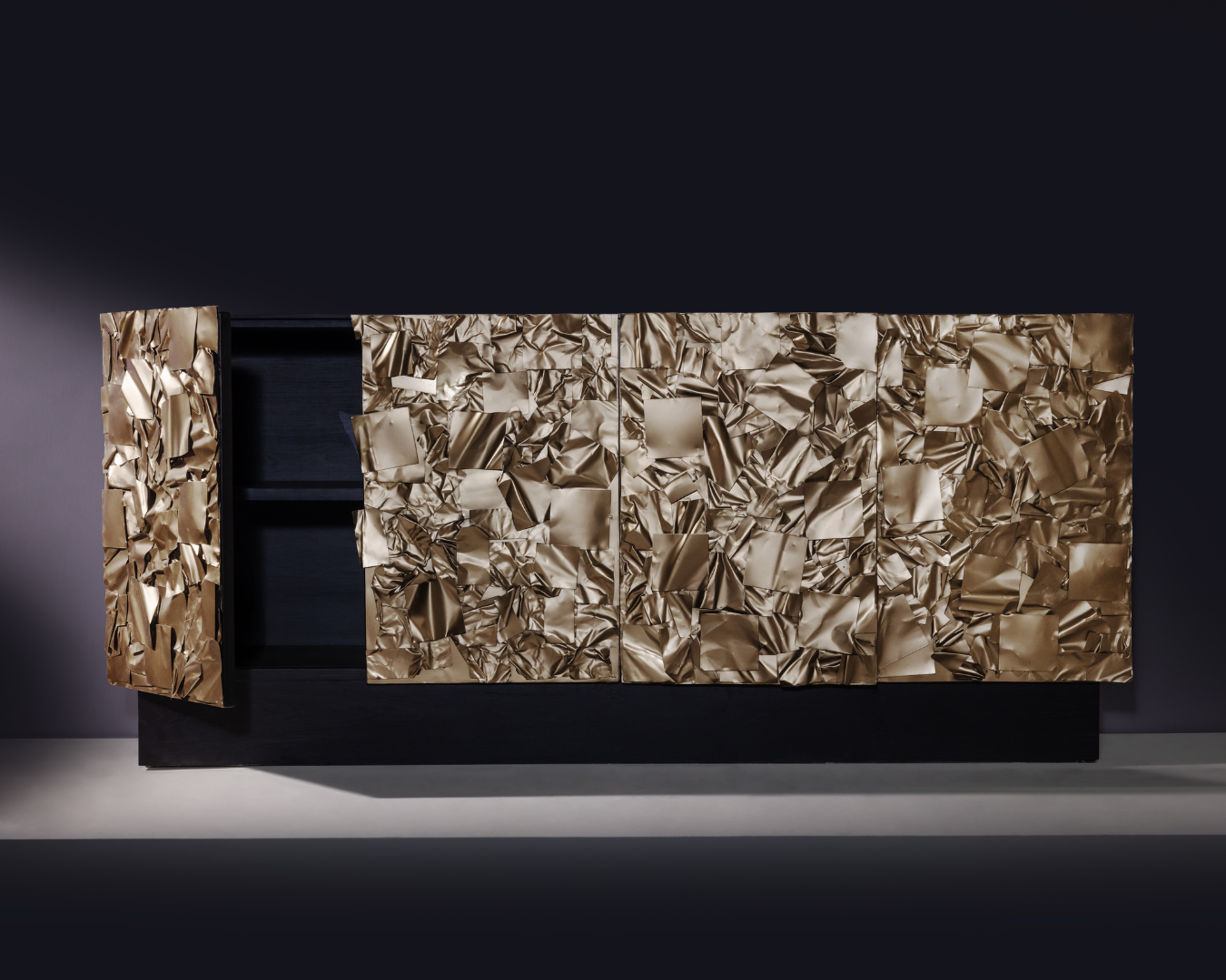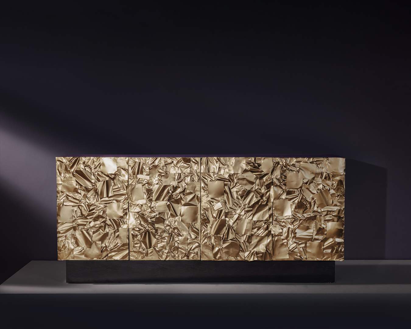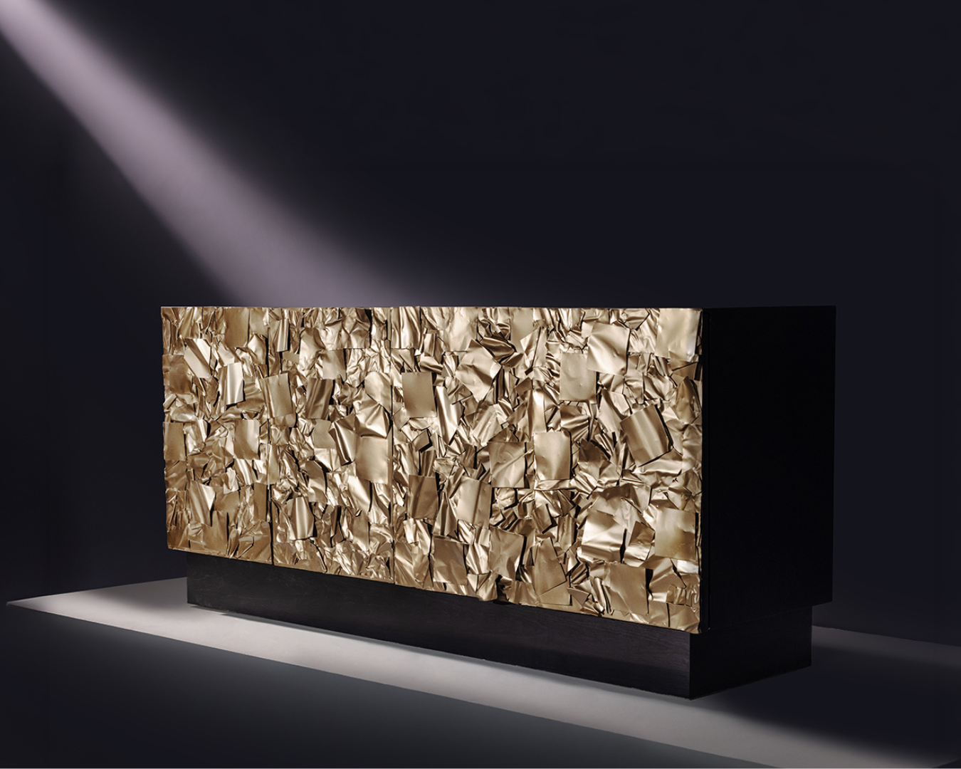 Vagues de Métal Gold cabinet takes inspiration from the untamed spirit of the sea – the perpetual rhythm of waves crashing against the rocks, sculpting and reshaping the shoreline. In this horizontal cabinet, that same energy has been translated into form through the medium of antique brass, set against veneere on ply.